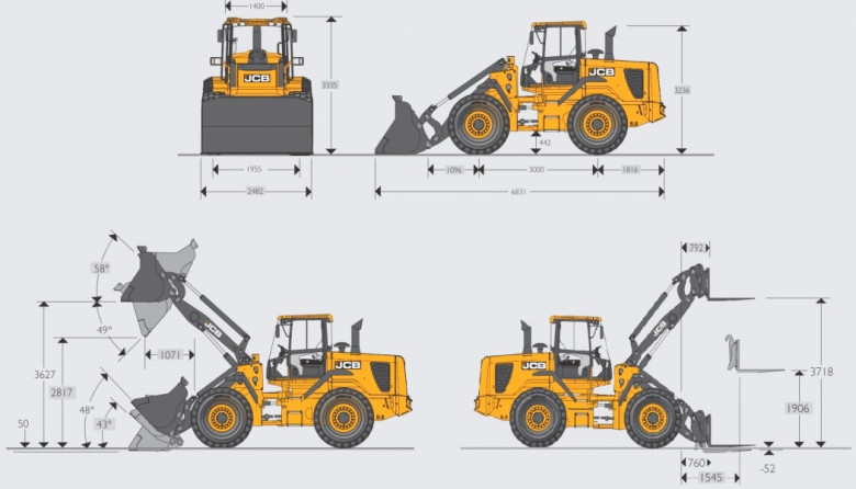 - Высота разгрузки ковша по режущей кромке при угле разгрузки 45º:2675 мм